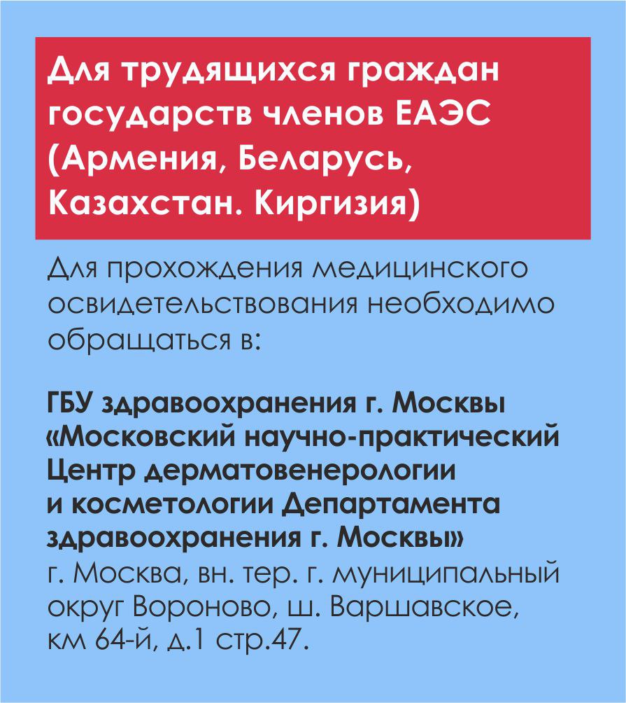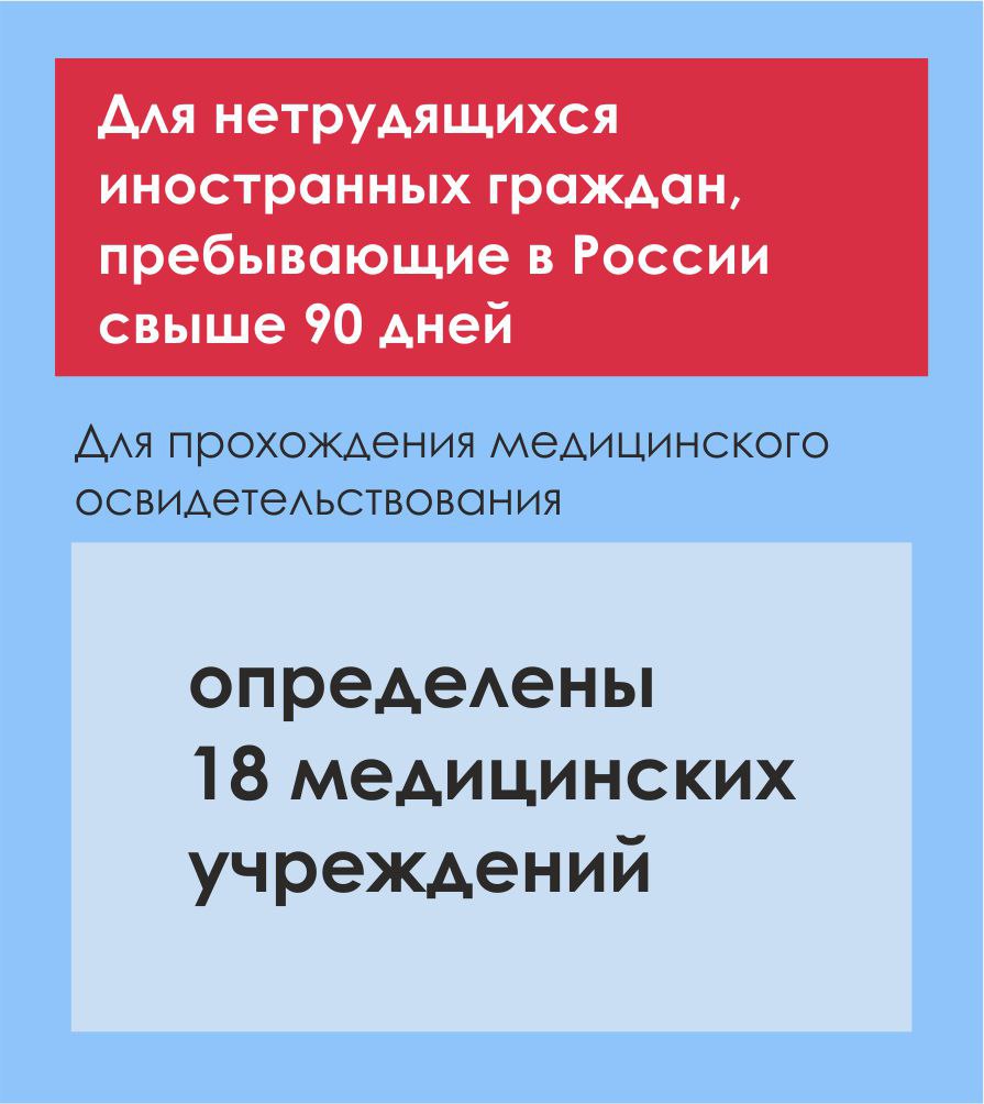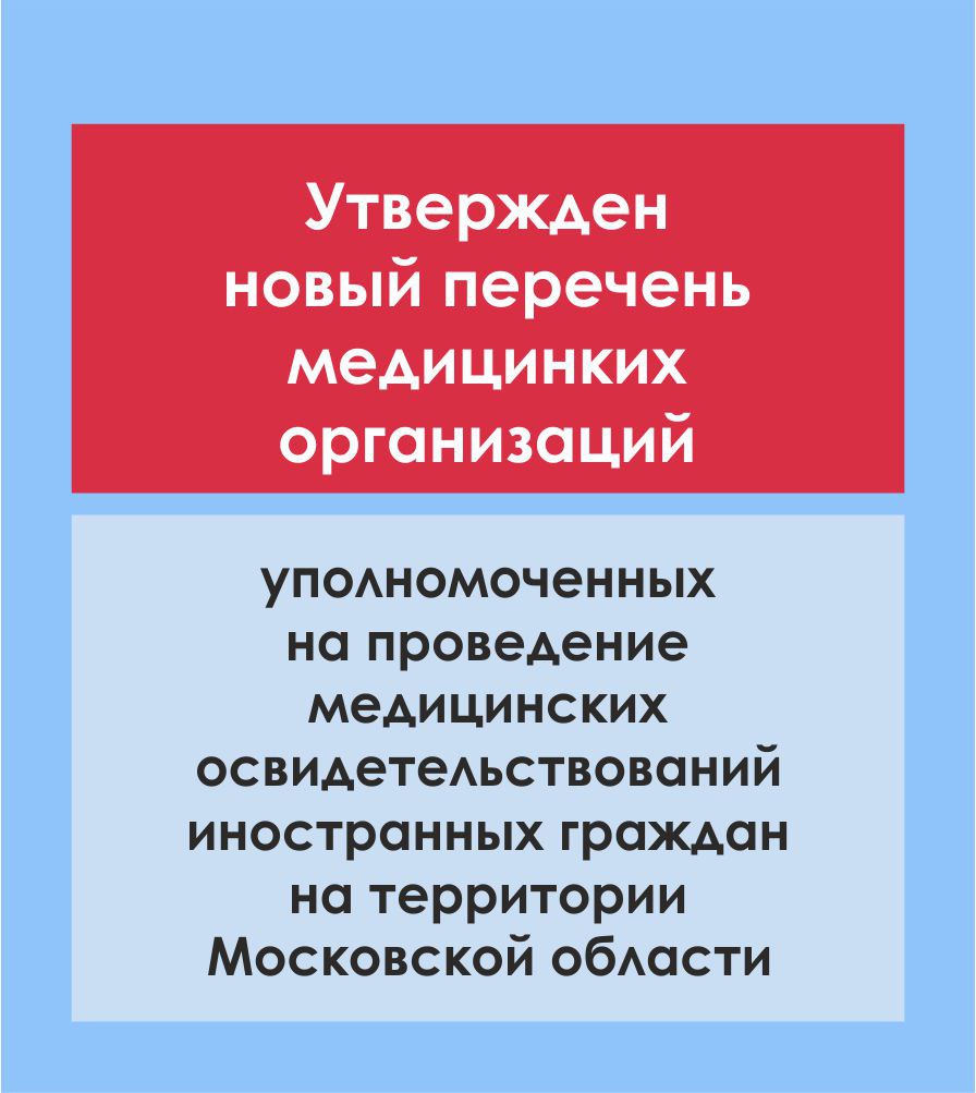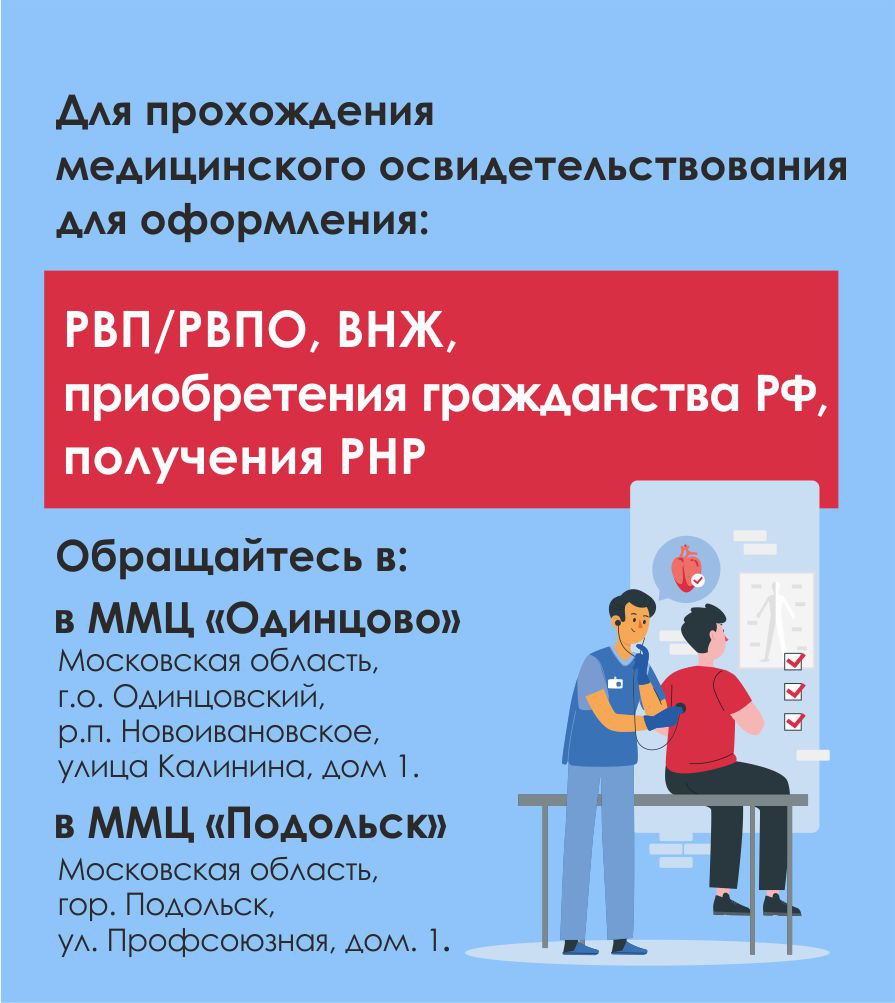 Утвержден новый перечень медицинских организаций, уполномоченных на проведение медицинских освидетельствований иностранных граждан на территории Московской области. Теперь с 15 сентября 2025г. иностранные граждане, в том числе граждане стран ЕАЭС, прибывшие для осуществления трудовой деятельности медицинское освидетельствование проходят на территории ГБУ «Миграционный центр» г. Москвы (ММЦ «Сахарово»). Для прохождения медицинского освидетельствования иностранными гражданами, прибывшими на срок, превышающий 90 календарных дней в целях, не связанных с осуществлением трудовой деятельности, определены 18 медицинских учреждений. Как и прежде для получения РВП, ВНЖ, а также для приобретения гражданства РФ медицинское освидетельствование проводится в ММЦ «Подольск» и ММЦ «Одинцово».